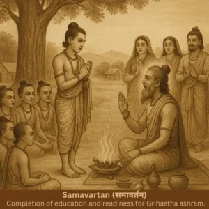 In ancient Indian tradition, Samavartan (also spelled Samavartana) marks the completion of formal education in a Gurukul and the student’s readiness to enter the next phase of life—Grihastha Ashram (householder stage). It is considered the Vedic graduation ceremony, symbolizing the end of Brahmacharya Ashram (student life).